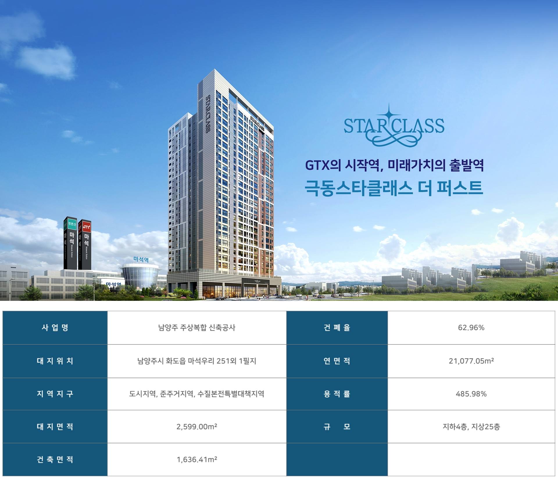 GTX-B 노선 마석역 역세권 비전 서울역과 강남을 더 빠르게 연결하는 쾌속 교통망의 중심 GTX-B 노선(예정) 및 경춘선 마석역을 통해 서울 도심까지 20분대 진입이 가능한 탁월한 미래 가치를 선사합니다. 총 552세대의 쾌적한 주거 대단지 지하 2층에서 지상 25층까지 조성되는 마석의 랜드마크 552세대 규모의 단지 구성과 세련된 외관 설계를 통해 지역을 대표하는 고품격 주거 타운으로 완성됩니다. 자연과 함께하는 힐링 숲세권 입지 단지를 둘러싼 풍부한 녹지와 쾌적한 생활 환경 송라산과 인접한 자연 친화적 입지로 도심 속에서 사계절의 변화를 느끼는 건강한 삶을 영위할 수 있습니다. 화도 체육문화센터 및 풍부한 인프라 쇼핑부터 문화까지 원스톱으로 누리는 편리한 생활 화도 체육문화센터, 롯데마트, 하나로마트 등 다양한 편의 시설이 밀집하여 주거 만족도가 매우 높습니다. 송라초, 중학교 도보 통학 안심 학군 아이들의 안전한 등하교가 보장되는 우수한 교육 여건 단지 인근에 학교가 위치하여 안전한 교육 환경을 원하는 학부모 수요층의 높은 선호도를 확보하고 있습니다. 특화 설계가 적용된 고품격 평면 공간 효율성을 극대화한 채광 위주의 단지 배치 입주민의 라이프스타일을 고려한 혁신 평면과 남향 위주의 단지 배치를 통해 쾌적한 실내 공간을 구현했습니다. 합리적 가격으로 만나는 내 집 마련 주변 시세 대비 경쟁력 있는 분양가와 탁월한 투자가치 GTX 개발 호재에도 불구하고 합리적인 공급가를 제시하여 실수요와 투자자 모두에게 매력적인 기회를 제공합니다.